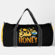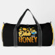 This delightful black duffle bag features a charming bee holding a stack of honeycombs, accompanied by the sweet phrase "Ohh HONEY". Other honey-themed elements float around, adding to its appeal. Perfect for beekeeping enthusiasts, honey lovers, or anyone who appreciates a sweet and whimsical design. Edit colour of the bag caps and body in the Design tool to your favored colours.