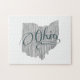A vintage style design of the outline shape of the buckeye state of Ohio filled in with an organic feeling grey background and the states name with typography font.
