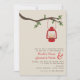 An outdoors wedding rehearsal dinner invitation with a wilderness / camping theme featuring an illustration of a red oil lamp hanging from a tree branch with green leaves. Personalise the text with your information.