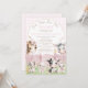 This adorable pink farm birthday invitation features sweet watercolor barnyard animals wearing bows, a pink fence, and soft gingham background — perfect for a little girl’s barnyard or petting zoo party theme.