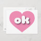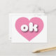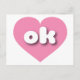 This postcard features a calm, cool pink heart containing the bold, rounded, white lower case letters ok, a playful version of the abbreviation for Oklahoma, the sooner state. The reverse side of the postcard is blank, awaiting your customised text or handwritten sentiments.