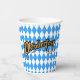 Oktoberfest paper cups done in the traditional Oktoberfest blue and white diamond checked pattern, with graphic text reading Oktoberfest.