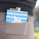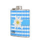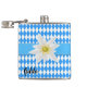 Oktoberfest themed drinking flask done in the classic blue and white diamond pattern for Oktoberfest, with graphics of a blue satin looking ribbon across the middle. Graphics of a single white edelweiss bloom, decorates the middle front of the flask. Personalise the custom black text, on the front, for yourself or as a charming gift idea for her.