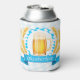Oktoberfest Frothy Beer Mug Can Cooler. Oktoberfest Frothy Beer Mug on chequered blue flag surrounded by a wreath of wheat.