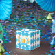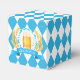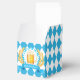 Oktoberfest Frothy Beer Mug Favour Box. Oktoberfest Beer Mug on chequered blue flag surrounded by a wreath of wheat.