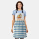 This vibrant AI artwork showcases a beer stein with pretzels alongside a woman in a traditional German Dirndl, making it the perfect design for Oktoberfest party aprons. The background and border feature the iconic Bavarian flag pattern, adding an authentic touch. Easily customise your party details by clicking the personalised blue button.