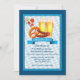 A festive Oktoberfest invitation featuring the traditional blue and white colours and check pattern. Fall leaves accompany the glasses of beer, pretzel and knockwurst. A blue banner has the word "Oktoberfest". (FDF)