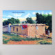 Vintage image of an old adobe house located somewhere in New Mexico. Bright red chilis adorn the outside, drying in the sun.