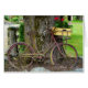 A colour photograph showing a vintage bike with its beautiful rust patina, leaning against a gnarled tree in someone's front yard. A basket on the handelbars holds pretty flowers. Customise any item with your own text or enjoy as shown.