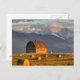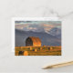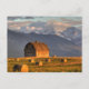 Old barn framed by hay bales and dramatic postcard