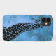 A blue coloured background design featuring the black silhouette of a giraffes head and neck.