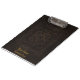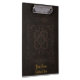 A clipboard printed with the image of an old book cover made from brown tooled leather with ornamental patterns, and optional golden text.