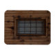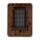 Old knotty brown oak mediaeval Spanish door with a centre window covered with black wrought iron bars.