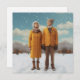 Serious looking retro couple in warm yellow clothes in the winter snow