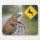 An elderly buck deer humorously leans on a walker, seemingly observing a deer crossing sign beside a road
