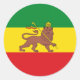 A round sticker with a historical flag of Ethiopia; red, golden and green horizontal stripes with Lion of Judah with a crown and spear in the center; used from 1897 to 1974