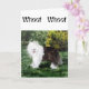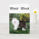 A fun greeting card for dog lovers with a painting of an Old English Sheepdog in the garden. Includes the text whoof whoof with a message inside saying 'that's happy birthday in dog speak!' Can be customised for any occasion or personalise with your own text. It is from my original glass painting. ©Annabel Potter