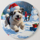 Old English Sheepdog Running in Snow Christmas Hat 6 Cm Round Badge