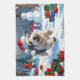 A fluffy Old English Sheepdog runs happily through the snow, wearing a bright red Christmas hat. The playful winter scene showcases the breed’s shaggy coat, gentle nature, and joyful spirit while capturing the festive magic of the holiday season. A charming design full of warmth and cheer.