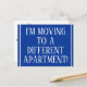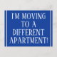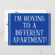 This traditional change-of-address postcard design features the message "I’M MOVING TO A DIFFERENT APARTMENT!" on the front, and a customisable message on the back. Postcards like this could be used to inform friends and relatives that the sender has moved to a new home.