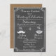 Old fashioned chalkboard wedding invitation with lips and moustache.