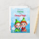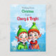 A pretty Christmas postcard with a cute little girl and boy elves in green and red with snowflakes Retro feeling old-fashioned Christmas.