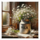 Daisy and baby's breath bouquet in old metal milk can by a sunny rustic farmhouse window