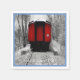 Photo of an old-fashioned heritage steam train chugging along the narrow gauge tracks. Black and white photograph except for the red caboose. Photo taken in Castlemaine Australia, and I believe includes Tait or "swingdoor" carriage cars and coal burning steam engine and tender.