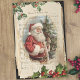 Nostalgic portrait of old world Father Christmas with Christmas tree and real sheet music to song "Message of Christmas Time" on weathered, torn paper with holly borders.