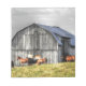 Weathered grey barn with herd of horses grazing in a green pasture.