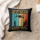 Funny and colourful drone pilot throw pillow features a silhouette drone, drone pilot, and trees on a colourful striped background with text that reads Never Underestimate an Old Man Who's Also a Drone Pilot!
