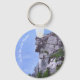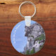 Key chain that shows "The Old Man of the Mountain", on a sunny day in summer among some evergreen trees .
