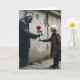An elderly woman extends her hand towards a mural of a man offering a vivid red rose on a weathered wall