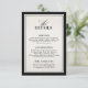 This old money inspired black and ivory wedding details card features a refined serif layout with an elegant script heading and structured information sections. Framed by a bold black border, the design reflects timeless sophistication and traditional black tie style.
