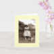 This retro sepia photograph of two little girl twins from the 1959 really stands out on this note card. The cute five year old identical twins are wearing their favourite rose print dresses that their mum made for them. They’re standing in the back garden of their council house with their big sister, she has her arms affectionately around their shoulders and she’s wearing a dress that shows the fashion for fully flared dresses worn with full layered net under petticoat to give extra fullness. The family cat has just wondered into the picture, the ginger tom cat was named Rusty. This old black and white photo shows a happy family scene from the 1950s era and makes a unique retro note card. This is a blank note card for you to add your own personal hand written message.