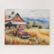 A beautiful vintage art 16x20 jigsaw puzzle for the serious puzzle person who loves country settings, old barns or vintage pickup trucks, this piece has tall late summer grasses in a field where an old red pickup truck is parked with a red barn and hills in the background, all in an autumn setting.