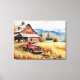 Lovely wall art for anyone who loves country settings, old barns or vintage pickup trucks, this piece has tall late summer grasses in a field where an old red pickup truck is parked with a red barn and hills in the background, all in an autumn setting.
