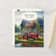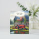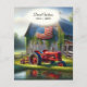 Old red tractor by a rustic wooden farm barn with an American flag.