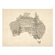 A map of Australia made from a collage of old and vintage sheet music, including some handwritten scores and notes, on an antique style background.