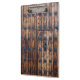 Well framed photograph of a large old brown wooden mediaeval door with wrought iron hinges and a smaller door within found in Barcelona Spain.