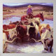 William Herbert “Buck” Dunton was an American artist known for his paintings of the early years of the American Southwest. This image is called “Old Texas” and depicts a cowboy herding longhorn cattle across a river.