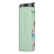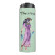This thermal tumbler bottle to keep your drinks cold or hot has a lady from old time Egypt wearing a purple dress, gold headpiece and holding a pale blue scarf on a green background with blue accents. Customise your name with the template.