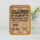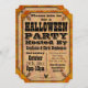 Classic and creepy invitation great for costume parties with cutout clipped corners and old-time poster effect party invitation. Grunge rustic and vintage western country saloon themed party invite with weathered orange and yellow rays of light carnival style grunge background with antique theme decorative elements including skull and thorn branches.