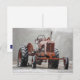 Postcard with a quirky photograph of an old tractor with a flat tire in the snow.