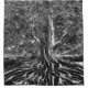An artwork featuring a very old tree with lots of roots and black and white colours.