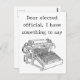In these turbulent and upsetting times, it is important to take action to protect your interests and promote your vision of a how government should work. Between election cycles, while you are waiting to cast your vote, there is something you can do. You can write your legislators and other elected officials to voice your concerns and tell them what you want done. Be that a protest, vote of support, or suggestion. One postcard may not seem like much of a force to be reckoned with, but multiply that by hundreds, thousands and millions of similarly minded constituents and you will, indeed, be a force of nature. Use this card as an attention getter when it lands in your official’s office mail. It is best to write your message in your own hand on the back side, along with the appropriate mailing address. You may also edit the text on the front to make the point a little differently.
