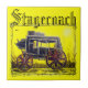 A Darker Rustic Wooden Old Western Stagecoach sits under a scorching desert sun landscape on a desolate dirt path among cactus as birds fly overhead. Old West image black coach on yellow background with a barbwire border around the outside edge of the image adding a rough persona and sharp edge of what one of the Old West's mode of transportation was. Stagecoach wording above image in old style lettering.