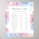 An Baby Gender Reveal Party Old Wives Tales Game poster. On an elegant light pink and blue smoke background, the typography text reads old wives tales, what will Baby your surname be? Within a white outline box a number of old wives tales are listed, including cravings, bump shape and how they relate to a girl and boy.