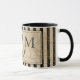 This nautical monogram ceramic mug features a black and beige striped background with a black anchor in the centre and world map overlay. Personalise the monogram with your own initials. Designed by world renowned artist Tim Coffey.