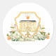 This round sticker features a royal crest at the top with a yellow chateau style building, and a royal crown surrounded by the crest border. The bottom of the crest has a floral arrangement and a banner where you can personalise with a name.